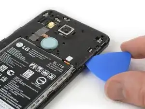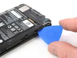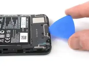 Проведите медиатором вдоль верхнего края телефона, чтобы освободить пластиковые защёлки, фиксирующие заднюю панель.