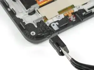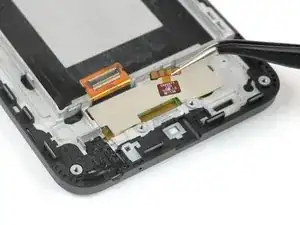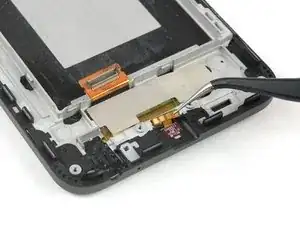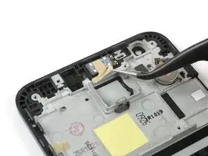 Используйте пинцет, чтобы аккуратно отодрать ленту, фиксирующую динамик разговорного канала.