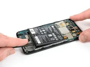 Поместите медиатор (opening pick) в отверстие для лотка SIM-карты и поверните его боком, чтобы освободить первую пластиковую защёлку, удерживающую заднюю панель.