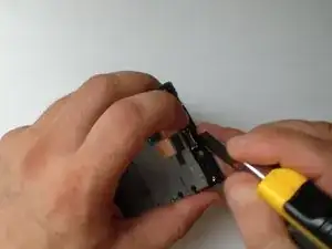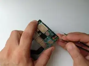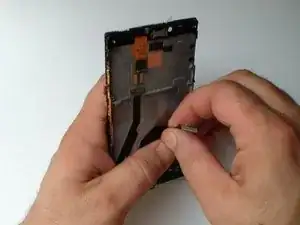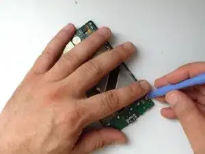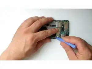 Используйте пластиковый инструмент с тонким наконечником и отклейте батарею от средней рамки.