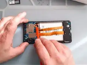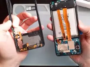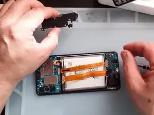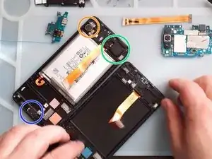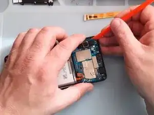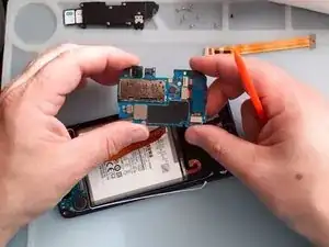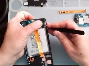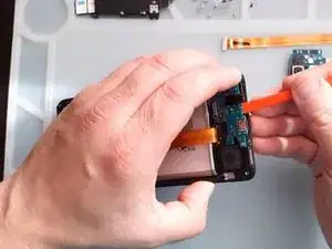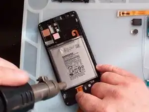 Используйте тепловой пистолет и пластиковые инструменты, чтобы снять аккумулятор.