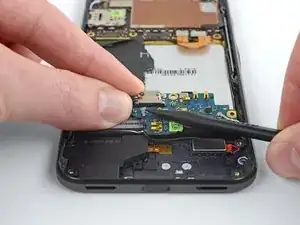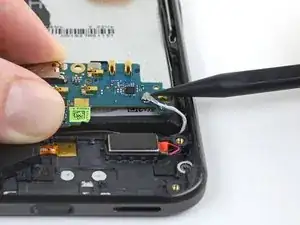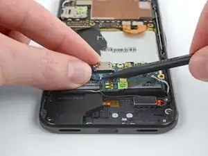 Используйте лопатку, чтобы поднять разъем кабеля динамика в верхней части, отключив его от материнской платы.