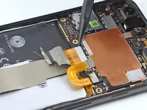 Не пытайтесь полностью снять дисплей пока, так как он все еще подключен через хрупкий шлейф. Будьте осторожны, чтобы не натягивать шлейф во время позиционирования дисплея.