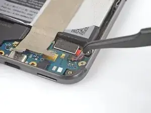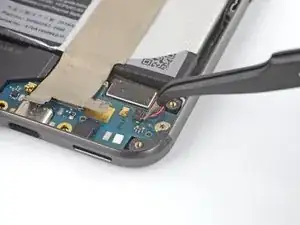 При повторном подключении этих кабелей положите дочернюю плату вверх ногами на батарею и используйте пинцет, чтобы аккуратно установить каждый разъем над соответствующим гнездом на плате, затем нажмите его вниз, пока он не защелкнется на месте.