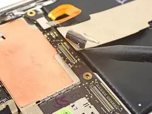 Используйте острый конец лопатки, чтобы приподнять и отключить кабель дисплея от разъёма.