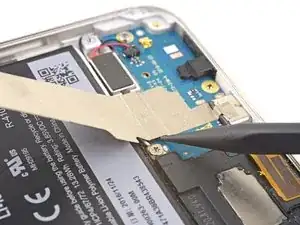 Используйте острый кончик лопатки, чтобы приподнять и отсоединить белый антенный кабель от его разъёма.