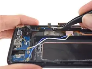 Если кабель датчика отпечатков кажется зацепленным или натянутым, не открывайте телефон дальше. Отсоедините разъем острием лопатки перед продолжением работы.