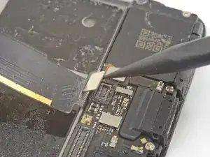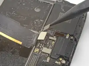 Используйте острый конец лопатки, чтобы поддеть и отсоединить соединительный гибкий кабель от материнской платы, который расположен над аккумулятором.
