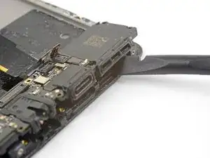 Просуньте плоский конец лопатки под отверстие динамика и аккуратно поверните лопатку, пока дочерняя плата не освободится от защёлок.