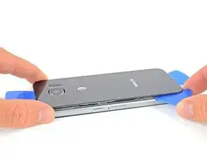 Проведите лопаткой вдоль нижнего края телефона, чтобы разрезать клей, фиксирующий заднее стекло.