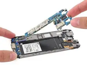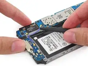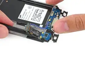 Не пытайтесь полностью снять материнскую плату, так как она всё ещё прикреплена к внутренней половине середины корпуса через разъём дочерней платы порта Micro-USB.