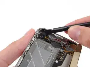 Используйте пластиковый инструмент для вскрытия, чтобы поддеть разъём нижней антенны и приподнять его из гнезда на плате логики.