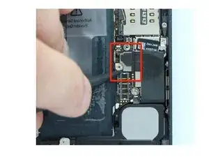 ВНИМАНИЕ: Не вытаскивайте логическую плату полностью! Wi‑Fi антенна подключена к нижней стороне логической платы. Используйте плоский конец нейлоновой лопатки, чтобы аккуратно приподнять нижний край логической платы настолько, чтобы можно было за неё ухватиться для извлечения.
