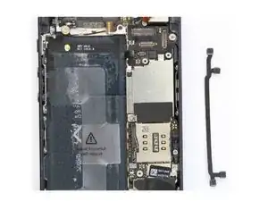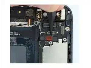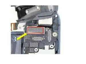 Чтобы снять экран EMI, слегка приподнимите его под углом пинцетом, затем сдвиньте экран в направлении аккумулятора и снимите.
