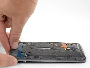Сначала с помощью пинцета и лопатки удалите и соскребите остатки клея как с задней крышки, так и с шасси телефона.