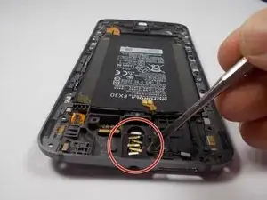 Используйте плоский конец лопатки, чтобы поддеть контакт батареи прямо вверх и вынуть его из разъёма.