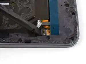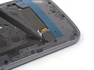 С помощью острого конца лопатки нажмите на небольшой зажим, фиксирующий левую сторону среднерамной панели, в сторону края телефона, чтобы освободить зажим.