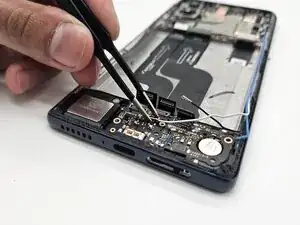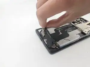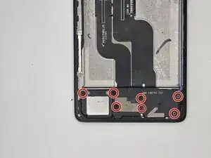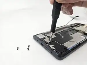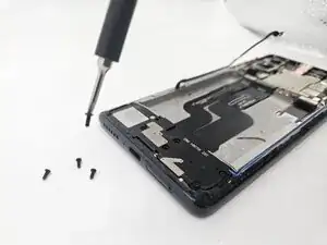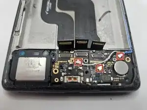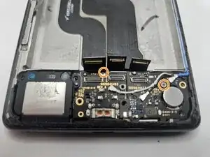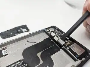 Используйте отвертку Phillips #00, чтобы удалить два серебристых винта длиной 1,5 мм, фиксирующих дополнительную плату и порт зарядки.