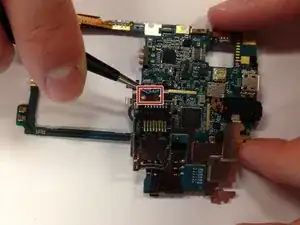 Это руководство содержит инструкции по снятию дополнительной платы с материнской платы в Samsung Mythic SGH-a897. Пинцет используется для аккуратного отсоединения дополнительной платы от материнской платы путем отщелкивания разъема.