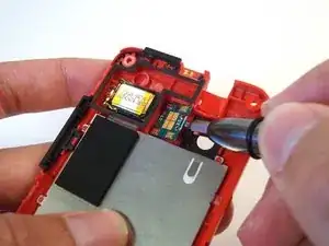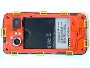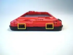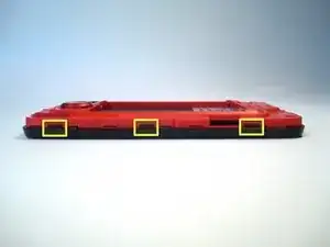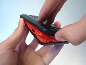 Начиная с нижней части телефона, аккуратно надавите на (красную) заднюю внутреннюю рамку за каждой чёрной защёлкой с помощью небольшой отвёртки с плоским жалом.