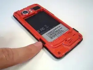 Вставьте палец в зазор между аккумулятором и задней внутренней рамкой, находящийся между аккумулятором и динамиком. Сдвиньте аккумулятор в сторону от динамика, увеличивая зазор.