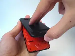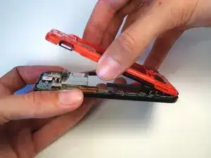 Аккуратно поднимите заднюю крышку вверх и отведите её от телефона. Возможно, потребуется провести ногтем вверх по разъёму, чтобы полностью отделить заднюю крышку от передней части корпуса.