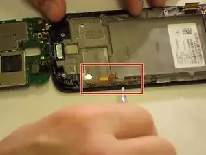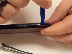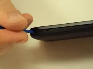 Расположите телефон так, чтобы экран был обращён к вам, а фронтальная камера находилась справа. Вставьте пластиковый инструмент для вскрытия между экраном и внутренней задней панелью и аккуратно подденьте экран.