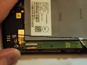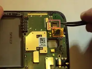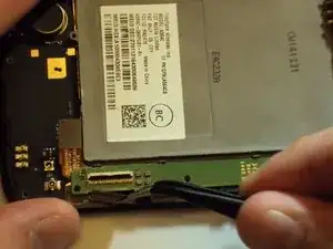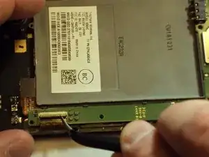 Используя пинцет, удалите ленту с верхней части защёлки. Продолжая использовать пинцет, поднимите чёрную защёлку, чтобы освободить шлейф.