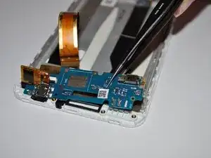 Также, начиная с верхней части телефона, отсоедините шлейф зарядного порта (другой чёрный кабель) и шлейф микрофона/кнопки. Отогните их полностью назад.