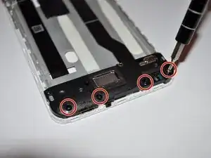 Снимите четыре винта Phillips #0 длиной 2,5 мм внизу возле динамика и снимите маленькую чёрную пластиковую крышку.