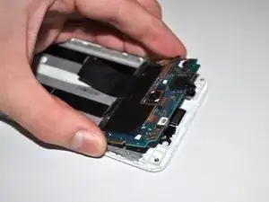 Начиная с верхней части телефона, отсоедините чёрный шлейф экрана (тот, который прямоугольный). Отогните его полностью назад.