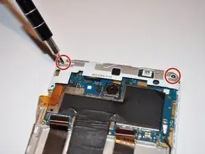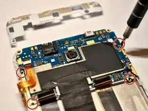 Снимите четыре винта Phillips #0 длиной 2,5 мм, удерживающие материнскую плату, и извлеките материнскую плату. Следуйте нашему руководству по замене материнской платы motherboard replacement guide.