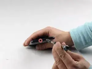 Используя отвёртку со сменной насадкой и битой PH0, начните с удаления панели под двумя камерами, выкрутив соответствующий винт.