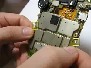 Осторожно повторите ту же процедуру для двух защёлок, прикрепляющих верхнюю часть экрана к материнской плате.