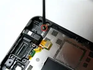 Используйте отвертку Torx T2, чтобы выкрутить первый маленький винт, расположенный в верхнем правом углу. Смотрите второе изображение.