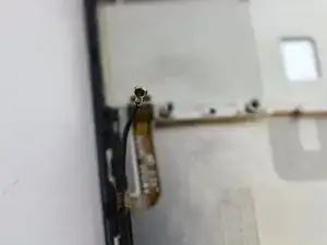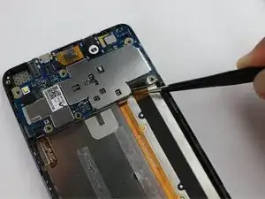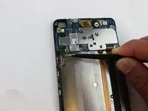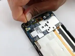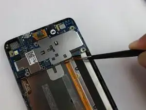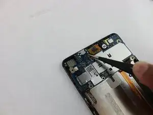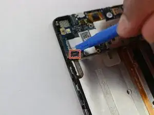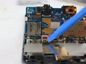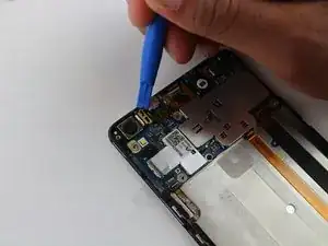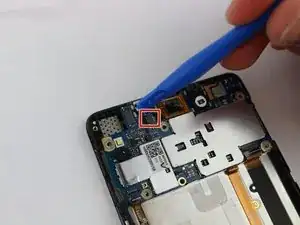 Снимите нулевой разъём на обратной стороне материнской платы, поддев чёрную защёлку маленькой синей пластиковой лопаткой. Затем извлеките материнскую плату из телефона.