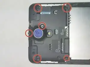 Клеевая поверхность, отмеченная красными кругами, приклеивает материнскую плату к шасси. Для отрыва с задней стороны телефона может потребоваться дополнительное усилие.