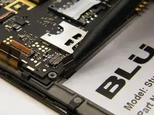 После снятия задней крышки найдите аккумулятор. Это большой блок, встроенный в телефон. На нём указаны BLU Products, предупреждающая надпись и штрих-код.
