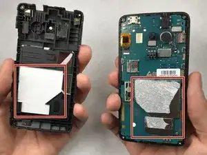 После освобождения защелок аккуратно отделите задний корпус от телефона. Обратите внимание на наклейку, которая находится в красном квадрате: она удерживает телефон вместе, но может быть снята.