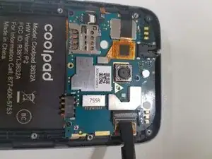 Перевернув плату, используйте пластиковой лопатку, чтобы отсоединить гибкий шлейф, соединяющий камеру с платой.