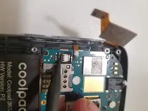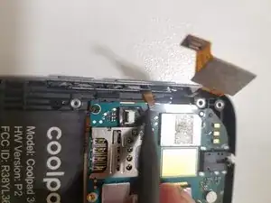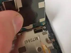 С помощью пластиковой лопатки отсоедините гибкие шлейфы экрана, боковых кнопок и дигитайзера.