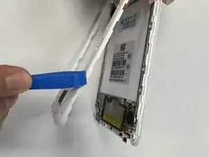 Используйте пластиковую лопатку iFixit, чтобы провести ею по контуру задней крышки телефона, ослабляя её и облегчая снятие. Крышка должна легко отделяться от шасси. Обязательно пройдите по всему периметру телефона.