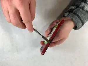 После извлечения лотка для SIM-карты вставьте лопатку между пластиковым корпусом и рамкой устройства, пока не услышите щелчок.