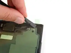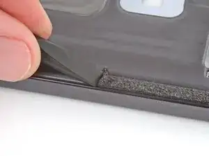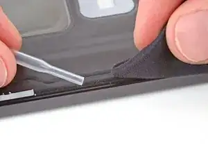 Проведите открывающим инструментом по периметру заднего стекла, чтобы отделить клей, фиксирующий его к панели дисплея.