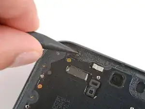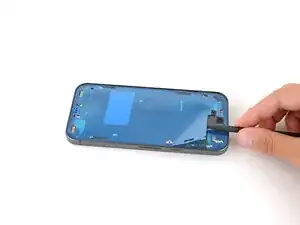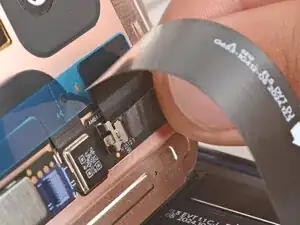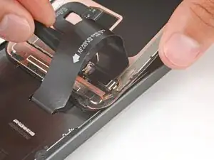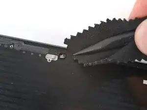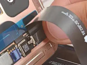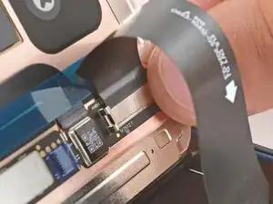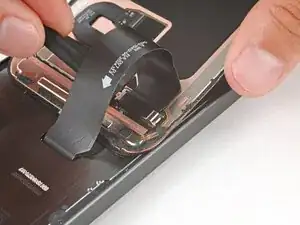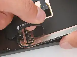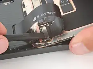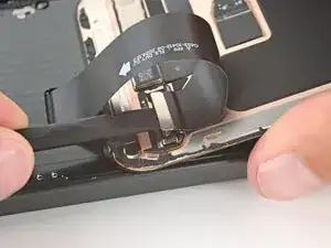 Используйте лопатку, чтобы аккуратно поддеть и удалить кусочек клея на кабеле экрана, рядом с разъёмом.
