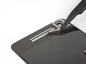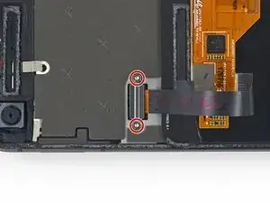 Выкрутите два винта T5 длиной 4,0 мм, которые крепят скобу кабеля дисплея.
