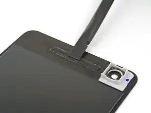 Если дисплей не поднимается легко, дополнительно подденьте его, чтобы отделить остатки клея. Клей рядом с верхним динамиком толще, чем в других местах.