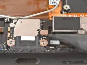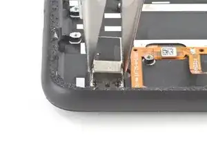 Если язычки аккумулятора порвались при извлечении, вставьте медиатор для вскрытия по верхнему правому краю аккумулятора и прорежьте клей под ним.