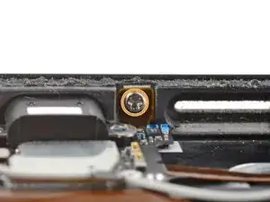 Используйте отвёртку Torx T3, чтобы удалить два винта 3,3 мм с притачанной головкой, фиксирующие сборку нижнего микрофона к нижней кромке рамки.