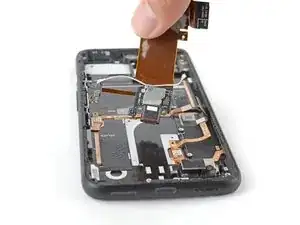 Продолжайте открывать заднюю панель, пока не сможете опереть её на левый край телефона, осторожно, чтобы не создавать напряжения на прикреплённом шлейфе.